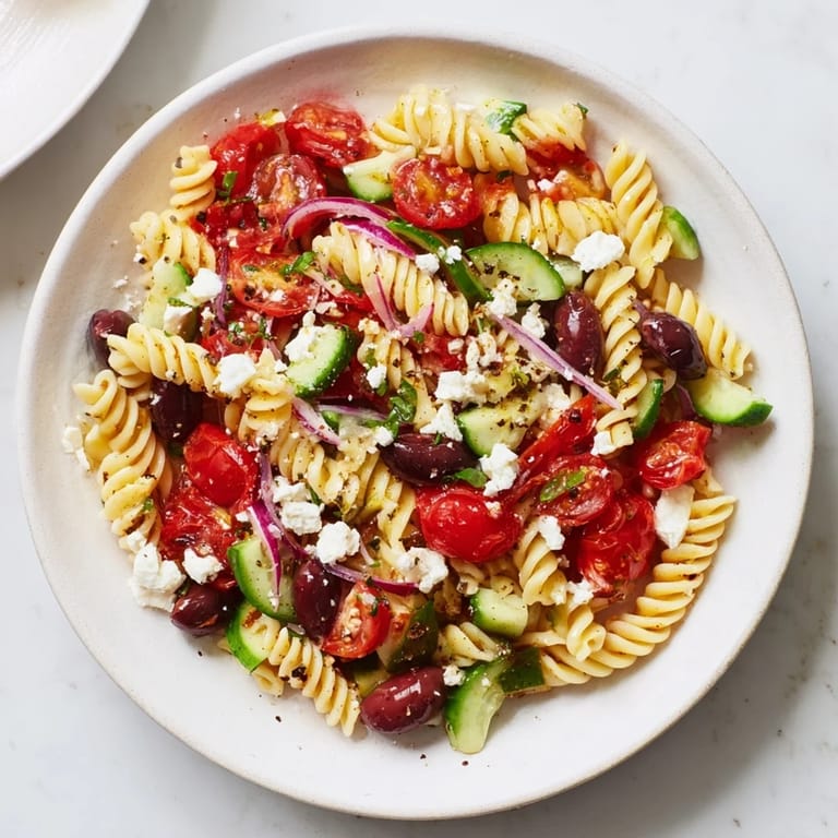 Save to Pinterest A vibrant, refreshing pasta salad featuring tangy feta, briny olives, ripe tomatoes, and crisp vegetables—all tossed in a zesty olive oil dressing. The perfect light Mediterranean-inspired plate for warm weeknight dinners.