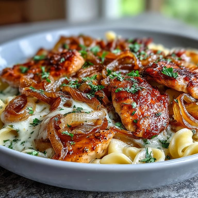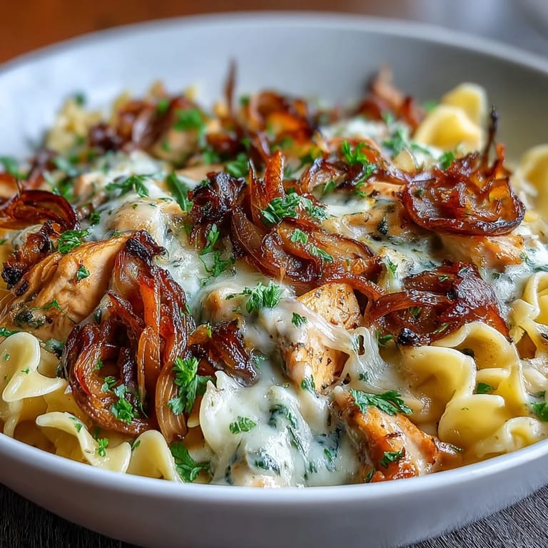 Save to Pinterest There's something magical about cooking pasta directly in broth instead of a separate pot, and this French onion chicken pasta stumbled into my life during a rushed weeknight when I wanted restaurant-quality comfort without the dishes. My kitchen filled with the smell of caramelizing onions—that sweet, almost nutty aroma—and I realized I was watching the foundation of French onion soup transform into something entirely new. One pot, thirty minutes, and suddenly dinner felt like an accomplishment worth savoring.