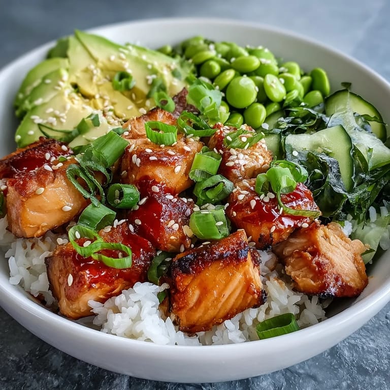 Save to Pinterest I stumbled onto this salmon rice bowl during a Tuesday afternoon when my fridge felt unnecessarily empty but my pantry whispered possibilities. A friend had gifted me a jar of sriracha mayo weeks before, and that day it finally called to me while I was thinking about dinner. The idea of marinated salmon cubes on fluffy jasmine rice felt suddenly obvious, the kind of meal that tastes restaurant-quality but arrives at your table in under 40 minutes. It became my go-to when I wanted something that felt both nourishing and exciting, without the stress.
