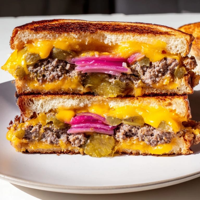 Save to Pinterest There's something about the smell of beef hitting a hot griddle that makes you stop whatever you're doing. One random Tuesday, I was standing in my kitchen deciding between making a burger or a grilled cheese, and I thought—why choose? That single moment of indecision turned into this dish, and now I can't imagine going back to picking just one. It's the kind of fusion that shouldn't work but absolutely does, with the smashed patty staying thin and juicy while the cheese melts into every crevice of the toasted bread.